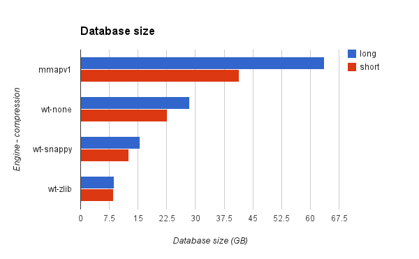 - Most interesting part of your results is the observation that snappy compression in WT does very little to fix this problem. It's good to note the commentary from your previous blog post that WT is configured to use different page sizes with snappy vs zlib (as the assumed use cases are different). It would be interesting (but not that important, really) to know if this difference is due to the compression algorithm or just the page size.