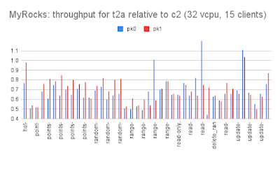 - x86 is worse than Arm for MyRocks with pk0 and similar with pk1